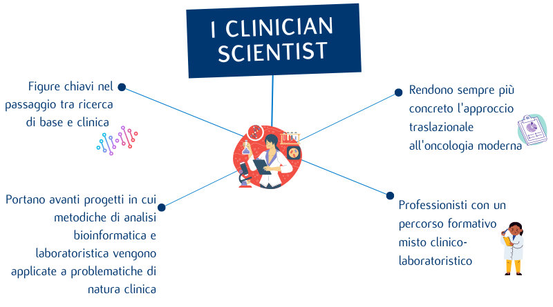 L'incredibile accelerazione nel progresso delle tecnologie di sequenziamento del DNA ha consentito di comprendere numerosi aspetti, spesso del tutto inattesi, della biologia tumorale. La disponibilità delle tecnologie di "Next Generation Sequencing" (NGS) rende sempre più perseguibile lo scenario della "medicina di precisione" in cui il trattamento viene deciso principalmente sulla base delle alterazioni molecolari specifiche per ogni paziente. Concepire le alterazioni molecolari come centrali nella gestione del paziente tumorale richiede tuttavia anche di modificare sostanzialmente l'approccio stesso al paziente ed è crescente l'esigenza di figure con competenze trasversali che integrino l'aspetto clinico con quello laboratoristico, quale quella dei clinician scientist.