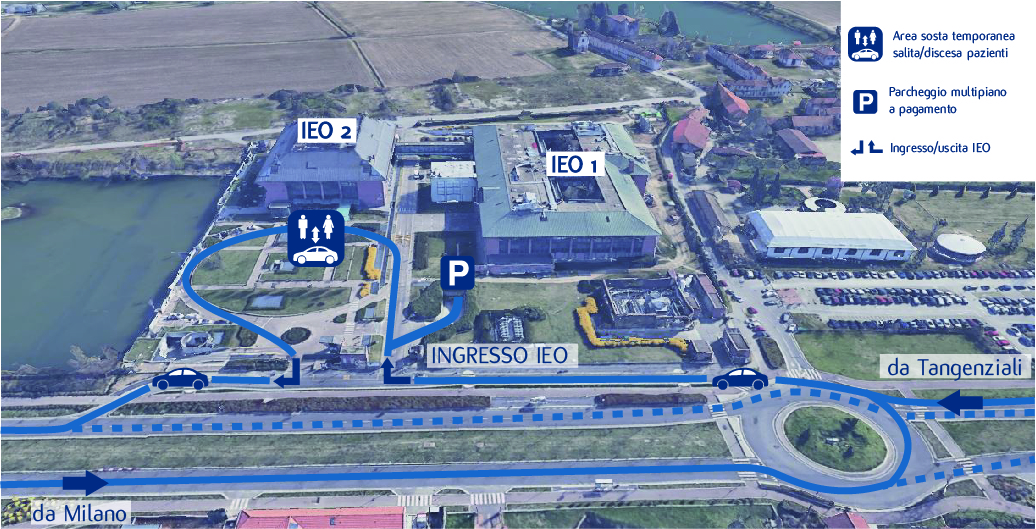 In IEO è disponibile un parcheggio interrato multipiano a cui si accede direttamente dall’ingresso principale, che si raggiunge dopo aver imboccato il controviale di via Ripamonti. Al vostro arrivo un addetto della sorveglianza vi fornirà le indicazioni necessarie.