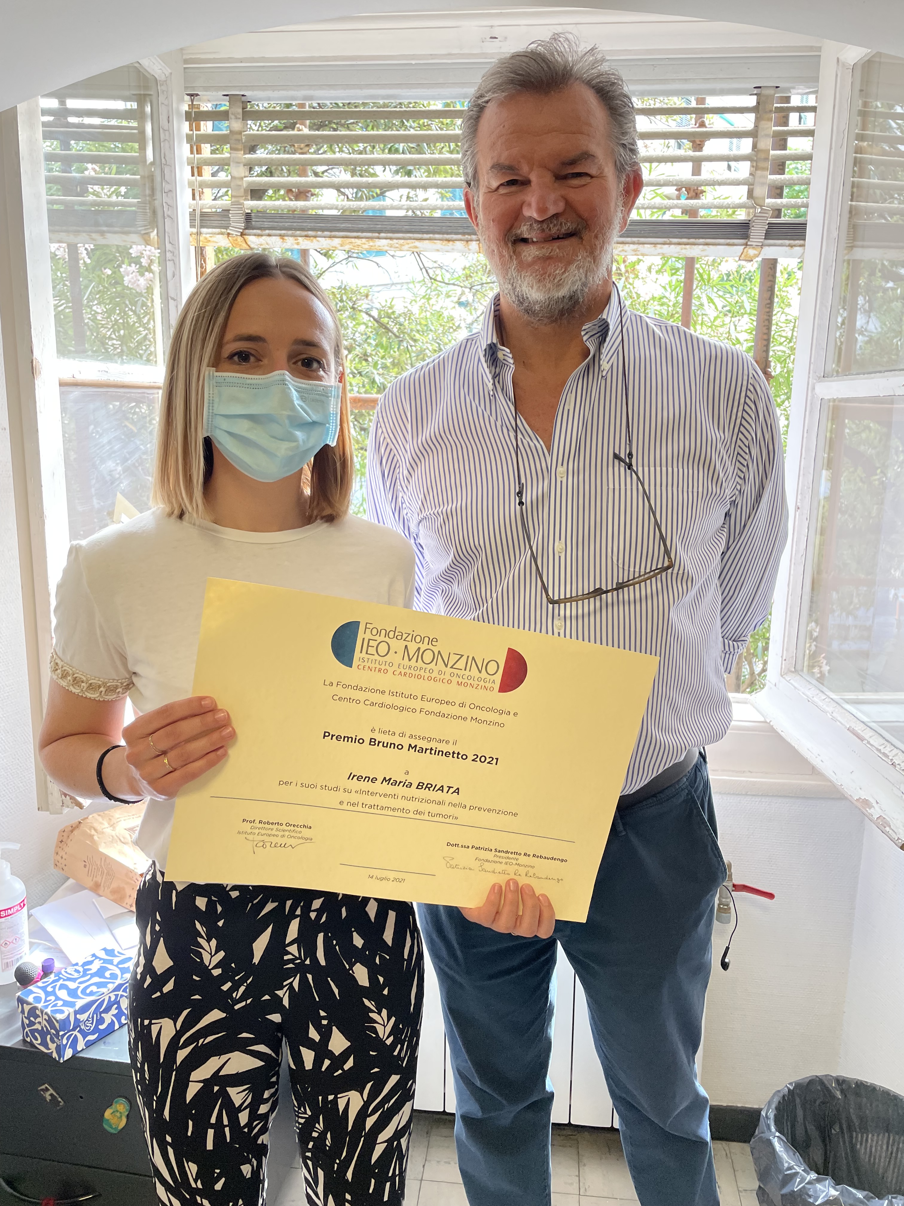 Il Premio Bruno Martinetto, assegnato annualmente dallo IEOattraverso la sua Fondazionea giovani brillanti ricercatori impegnati in studi clinici sulla prevenzione e genetica oncologica, quest’anno è andato a Dottoressa Irene Briata, biologa nutrizionista che collabora con la Struttura Complessa della Oncologia Medica degli Ospedali Galliera di Genova diretta dal Professor Andrea De Censi. La sua presentazione "Interventi nutrizionali nella prevenzione e nel trattamento dei tumori" ha destato molto interesse dato l’argomento di grande attualità.